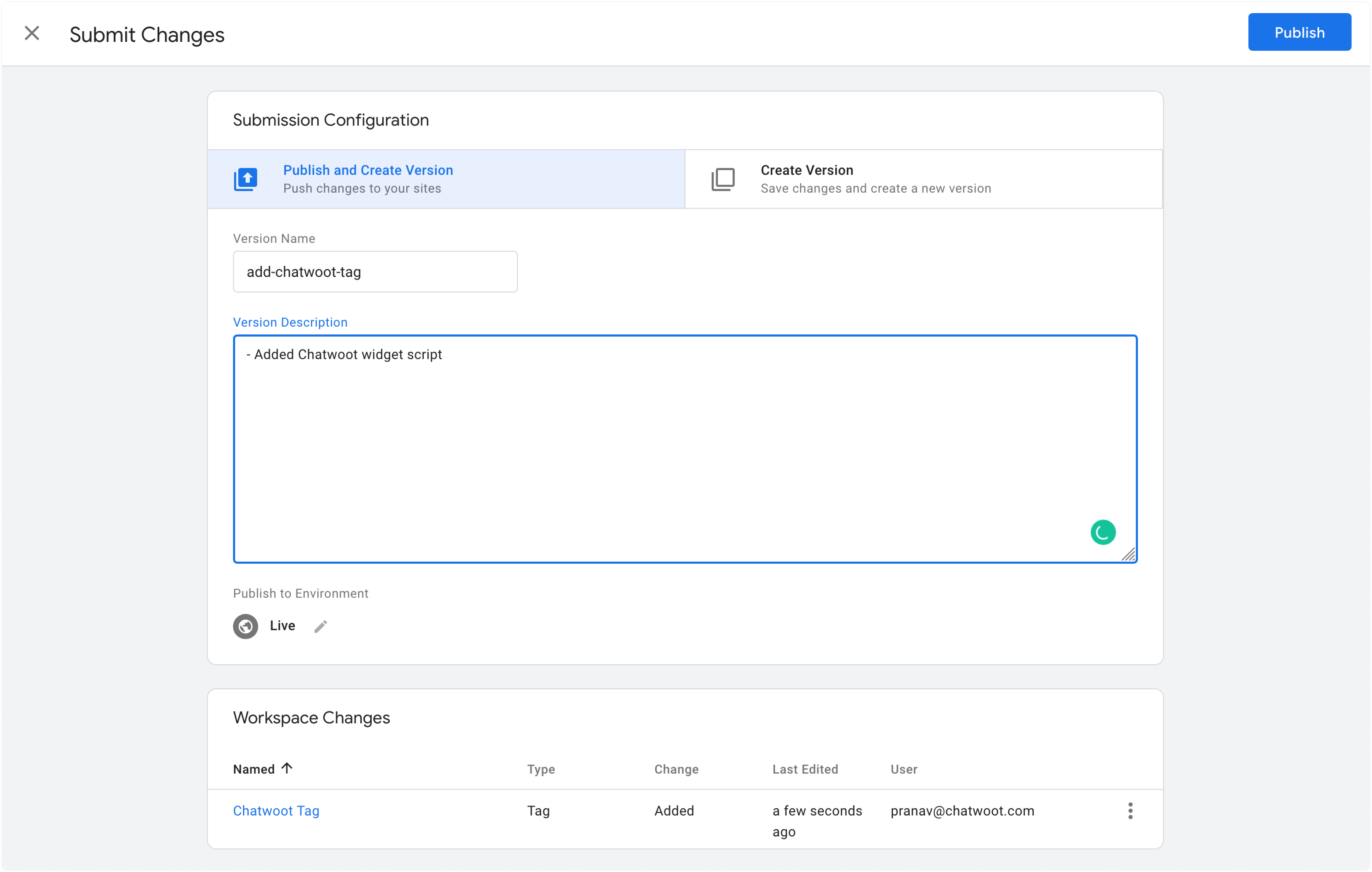 Haz clic en «Guardar» para almacenar la etiqueta. Ahora podrás ver la etiqueta listada bajo los cambios del espacio de trabajo. Haz clic en «Enviar» para desplegar la etiqueta. Proporciona un nombre de versión y publica los cambios haciendo clic en «Publicar».