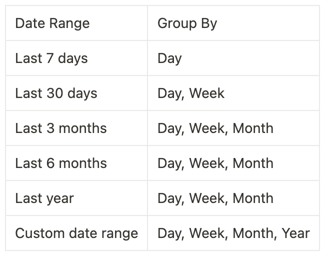 Una vez que seleccionas la duración, puedes decidir cómo agrupar tus datos. Cada rango de fechas tiene diferentes opciones de agrupamiento. La tabla a continuación muestra el mapeo de rangos de fechas para el filtro de agrupamiento.