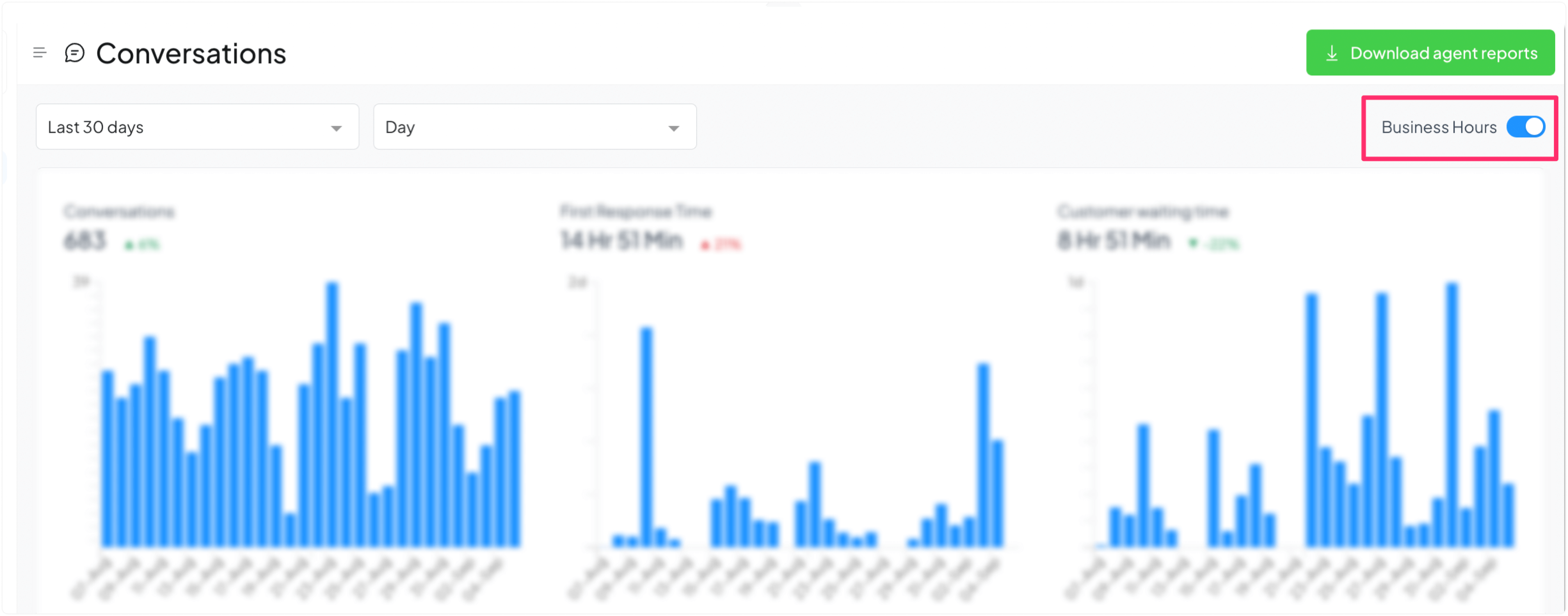 Las horas laborales se utilizan para configurar la disponibilidad del equipo en cada canal. Si las horas laborales están habilitadas, los datos del informe se calcularán en función de estas horas. Consulta aquí para configurar las horas laborales.